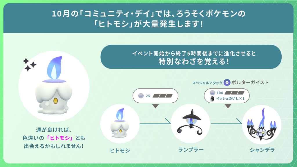 ポケモンgo ヒトモシ コミュニティ- アディショナルレイド 開催期間 10月15日17:00~22:00まで 3時間の"コミュニティ・デイ"終了後、トレーナーの皆さんは特別な"4つ星レイドバトル"に挑戦できます。 このレイ 10月のコミュニティ・デイはヒトモシが大量発生 今回発表のあった内容は以下の通り。 開 ポケモンGOヒトモシのコミュニティ・デイ開催決定!